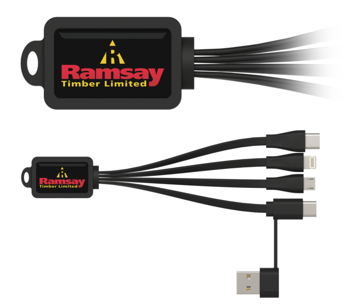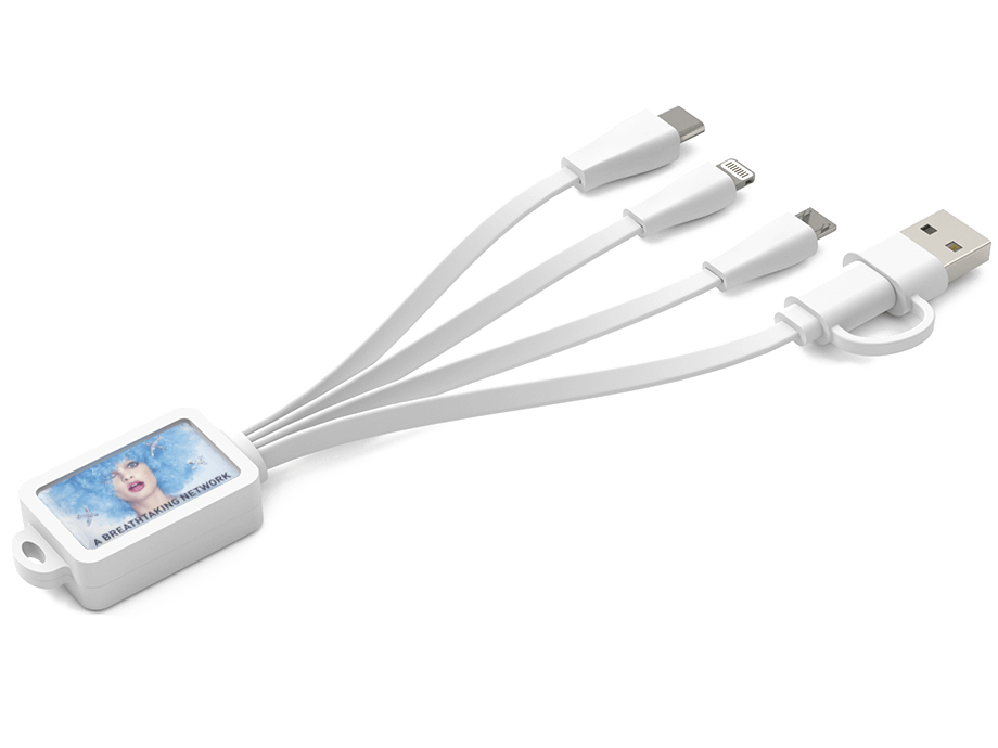 Our USB multi-charger cable is the perfect promotional item to stay connected and fully charged while on the go. The cable features 3 different connectors, including micro USB, type-C, and lightning cable connectors with a standard USB power cable. This allows users to charge multiple devices simultaneously, making it an essential item for busy professionals or travellers.